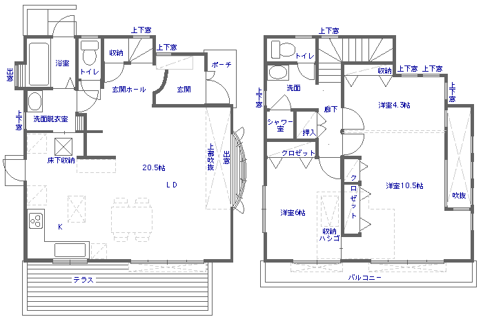 2階にはお子さまがまだ小さいので将来的に2部屋分割が可能(出入り扉を2つ)にした11帖と11.95帖のLDKで、子供部屋の2つの扉を開ければ一体の空間(22.95帖)として使用可能にした3LDKを設計しました。